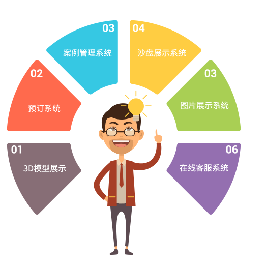• 沙盘展示系统:采用FLASH技术结合小区沙盘实景或规划图,制作成互动式的立体导航系统,鼠标移到相应的板块可查看项目各版块的详细介绍,并查进入相应的户型图展示。