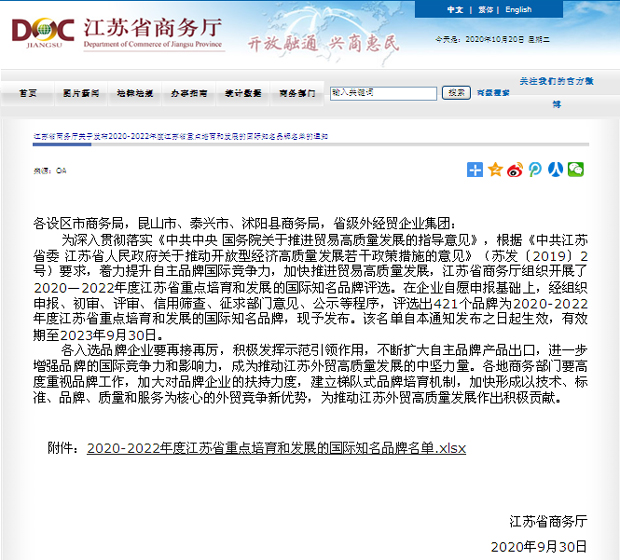 日前,江苏省商务厅正式发布“2020-2022年度江苏省重点培育和发展的国际知名品牌”名单,米乐n6平台成功入选。