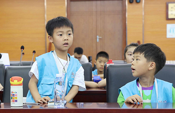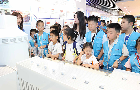 活动第二站——上上展厅,开启了小记者们对上上发展史的探索之旅。小记者们通过历史照片、影像资料和荣誉奖牌,全面了解上上电缆58年的奋斗历程。当解说员介绍到上上的企业规模时,“上上电缆真的是(全球绝缘线缆企业规模排名)中国第一全球第七吗?我不信!” 起初充满质疑,但随着一块块奖牌、一座座奖杯的展示,他们的疑问逐渐转化为惊叹。连续三届荣获中国质量奖提名奖、自主研发的全球绝缘线缆电压等级最高——750kV交联聚乙烯绝缘电力电缆、填补世界空白的三代核电缆……这些硬核实力是上上58年奋斗的成果。“我们溧阳这么小小的县城,居然能孕育出规模这么大的企业,上上真了不起!”小记者们真切感受到家乡企业的非凡实力。