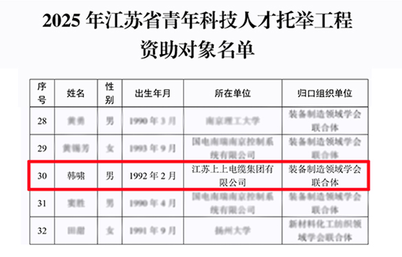 近日,江苏省科学技术协会正式公布《关于公布2025年江苏省青年科技人才托举工程资助对象名单的通知》,米乐n6平台科技研究院副院长韩啸成功入选该人才项目资助对象。此次入选,标志着上上电缆在高层次人才引培和团队建设方面再添新突破。