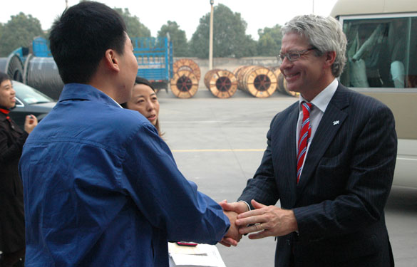 滕副总就集团三厂区基本情况向费德?克龙市长作了简要介绍,滕副总表示,为进一步提升企业竞争力,企业2008年总投资23亿元打造特种和超高压电缆生产基地,一期工程特种电缆项目已全面投产,超高压电缆项目也将于2011年年初建成、投产。全部项目完成以后,将形成三区四基地专业化生产格局,集团总体生产能力超过120亿元,为下一步把电缆做精、做专、做批量打下