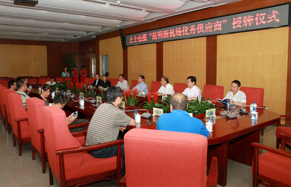 会议上,丁董事长首先对昆明新机场的转场成功并投入运营表示热烈祝贺,并就企业基本情况向各位领导作了介绍。丁总表示,上上对昆明新机场合同高度重视,指派专人跟踪合同执行过程,确保产品按时完成,以满足新机场建设需要。最后,他希望双方能够开展进一步合作,并希望各位领导到上上参观指导。
