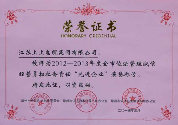日前,米乐n6平台喜获“2012-2013年度全市依法管理诚信经营勇担社会责任‘先进企业’”荣誉称号。