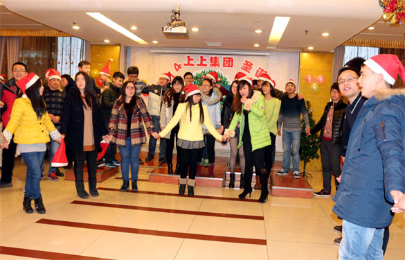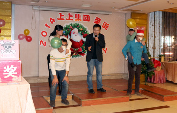 大饱口福之后,狂欢帷幕正式拉开。三对青年夫妻带来的暖场舞《小苹果》激情动感,顿时点燃狂欢热潮;游戏“猪八戒背媳妇”、“一心可二用”等搞怪有趣,逗的大家捧腹大笑;中途冒牌明星献唱,技术中心新入职员工帅气堪比许文强,一曲《上海滩》博得现场阵阵掌声;“吸管运输”游戏,男女齐上阵,大家在默契配合中增进了友谊。最后来自五湖四海的上上员工,手牵手,一起欢唱歌曲《朋友》,和谐的旋律在上上大家庭里环绕,友情在其乐融融的氛围中绵延。